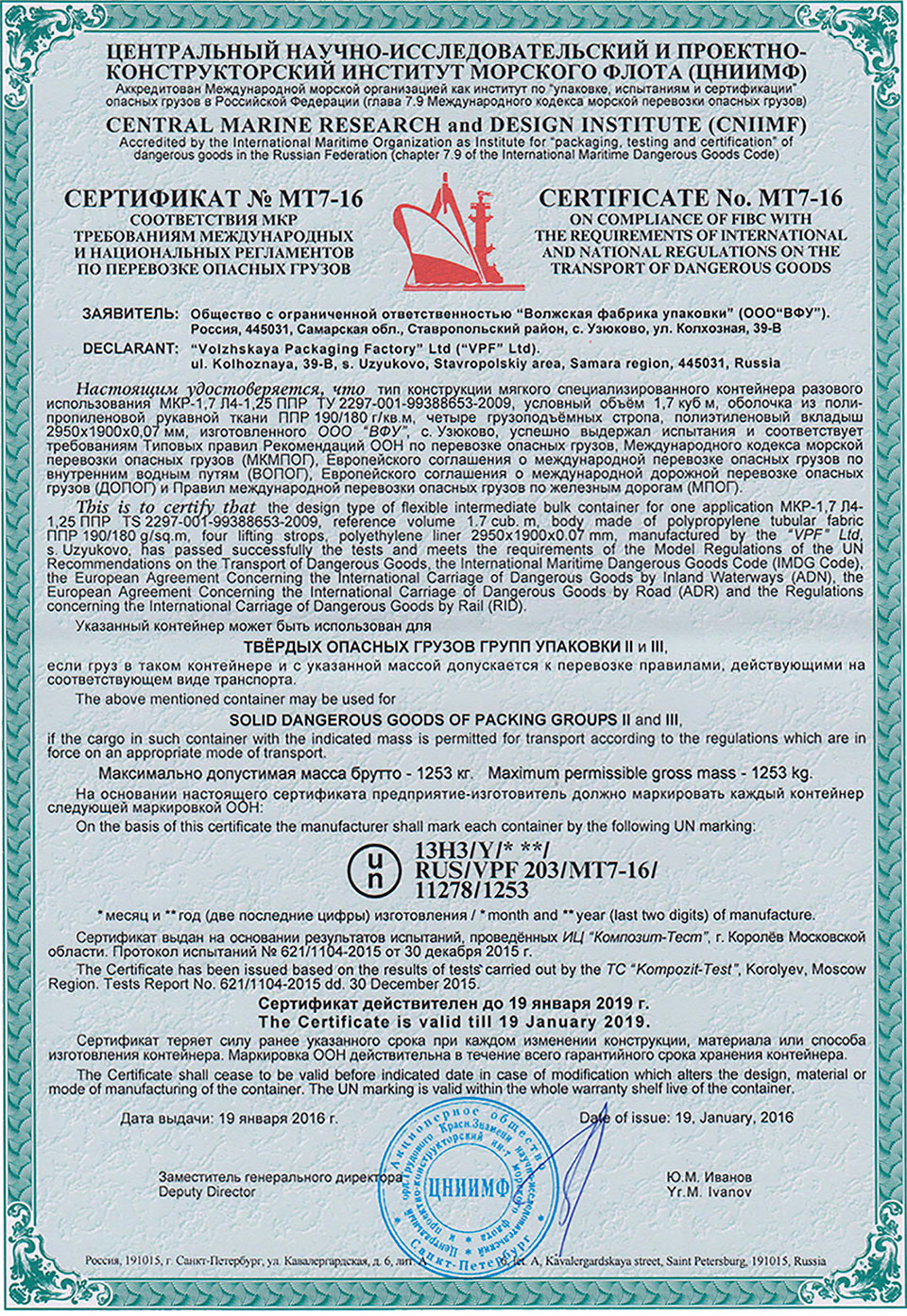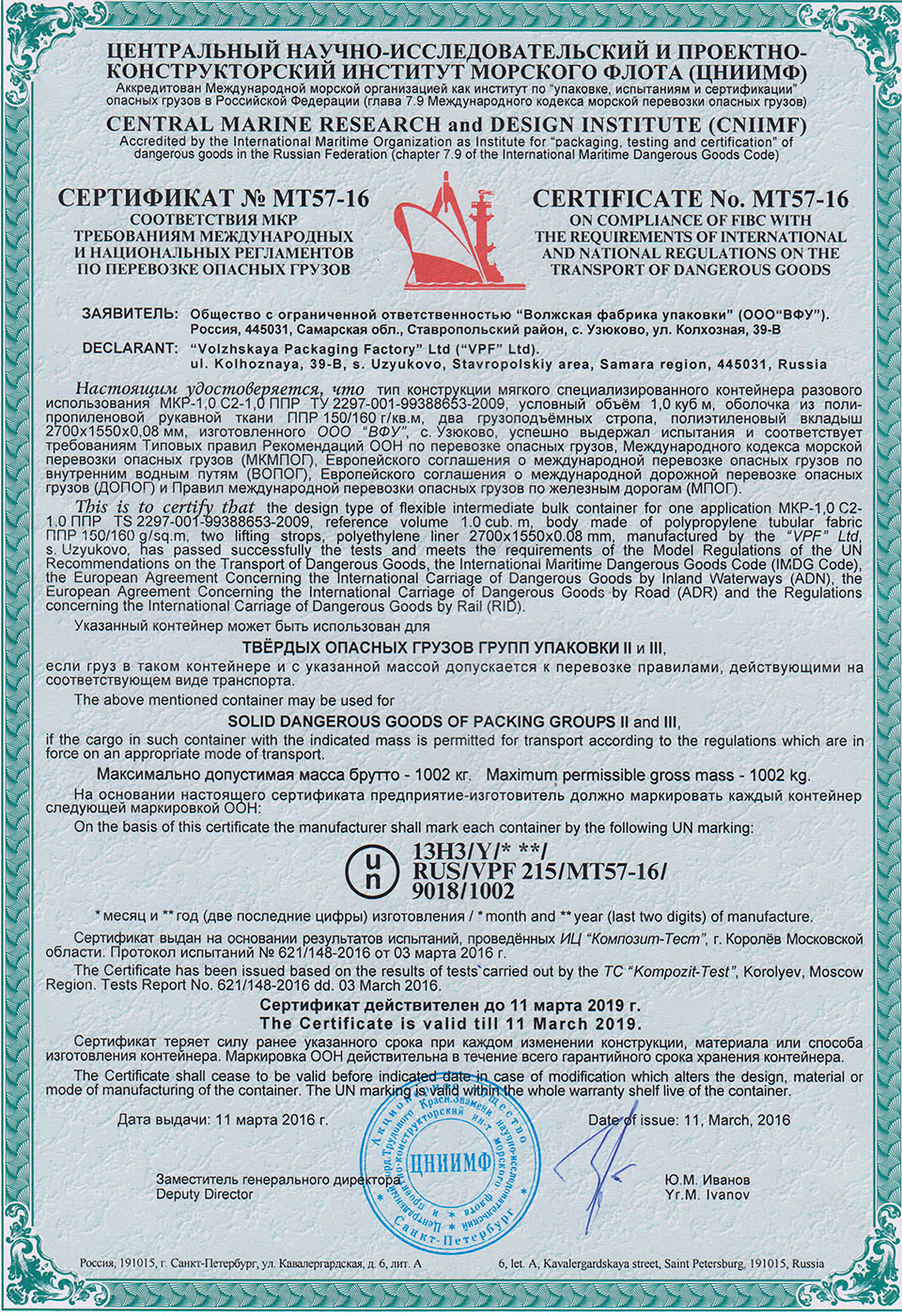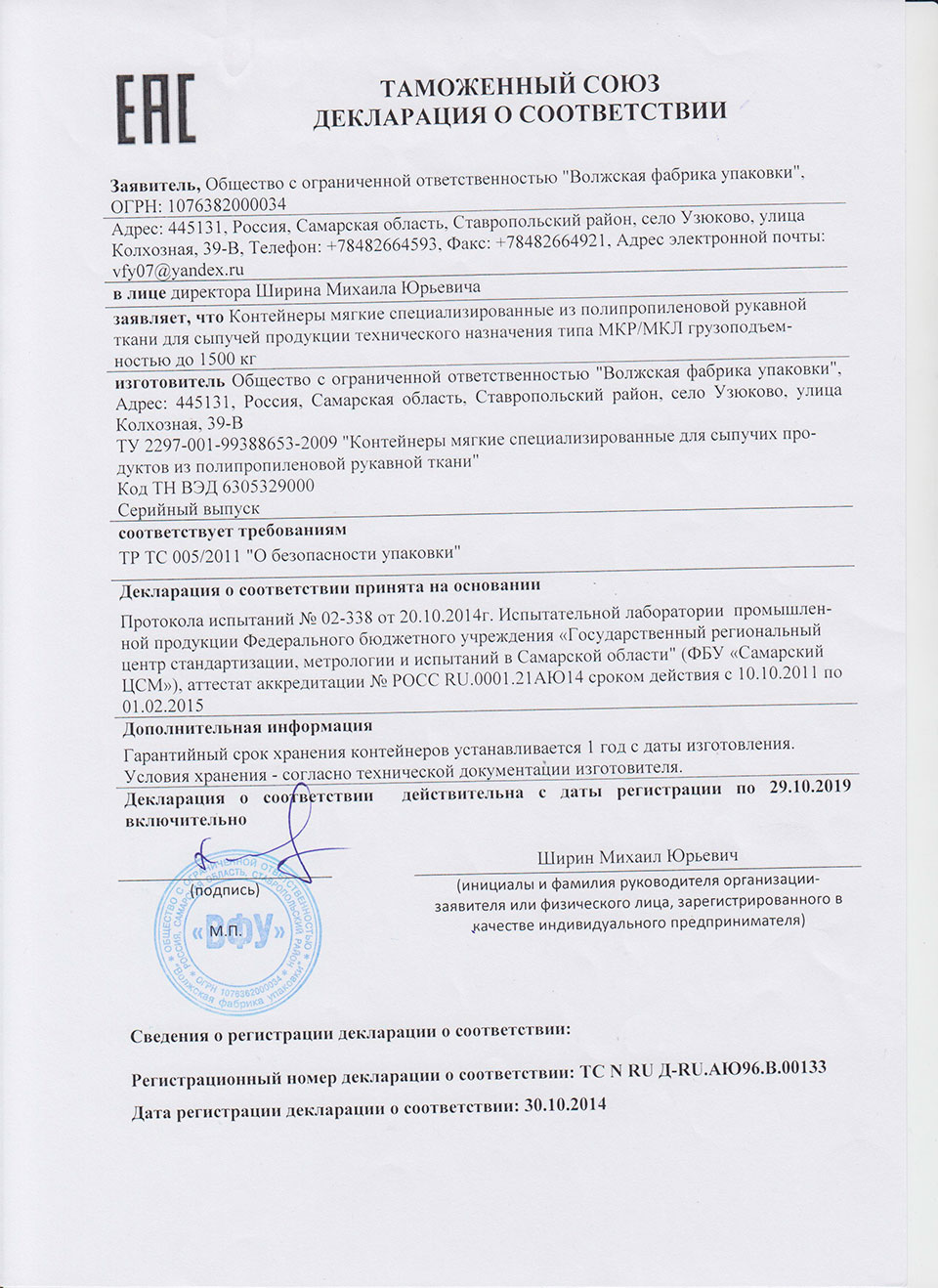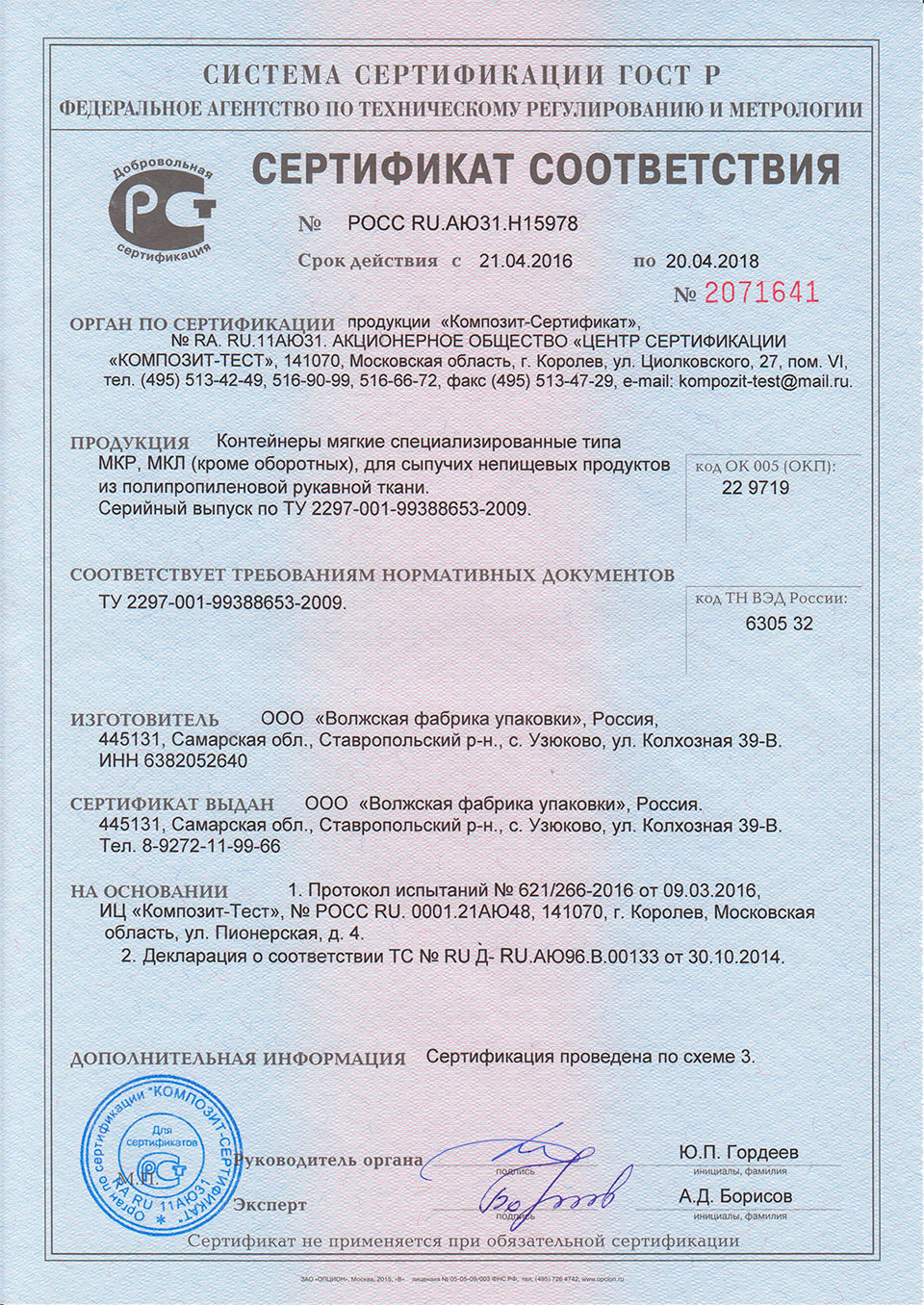 Продукция "Волжской фабрики упаковки": мешки полипропиленовые тканые, магкие контейнеры МКС (биг бэг, биг-бег, big-bag) сертифицирована на соответствие российским и международным стандартам, ее можно купить и использовать для хранения и перевозки грузов в России, Европе и других регионах.